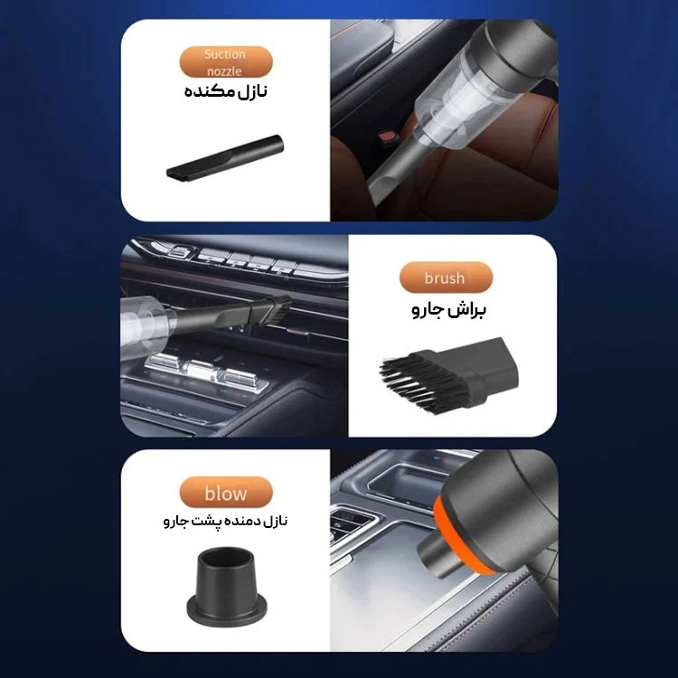سایر توضیحات:دارای مکش قوی و موتور توربو با سرعت بالا دو کاناله بادوام قابلیت مکنده و دمنده دارای فیلتر نانو قابل شستشو قابل استفاده در خانه و ماشین دارای سری تخت و بلند دارای سری برسی دارای کابل شارژ تایپ c سرعت 65000 دور در دقیقه توان 60 وات قدرت مکش 6000 پاسکال نوع باتری لیتیومی 1200 میلی آمپر